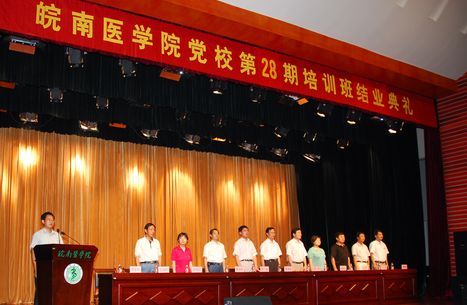 结业典礼在庄严的国歌声中拉开帷幕。郑勇超副书记代表校党委向学员表示衷心的祝贺,并向为此次培训班付出辛勤汗水的同志们表示衷心的感谢。在简要回顾本期培训班学习背景后,他总结了评估期间广大师生的积极表现,并为评估取得优异成绩而向全校广大师生表示衷心的感谢。为鼓励学员加强党性锻练,他对学员提出四点希望和要求:一、高举旗帜,坚定理想信念。要用马克思主义中国化的基本理论武装头脑,树立正确的世界观、人生观、价值观,坚定永远跟党走中国特色的社会主义道路的信念,为共产主义奋斗终身。二、牢记校训,勤奋刻苦学习。要牢记“精医、尚德、求实、自强”的校训,坚持学习,养成良好的学习习惯。三、继承传统,弘扬“艰苦创业,顽强拼搏,服务社会”的皖医精神。四、讲党性、重品行、作表率,把做人与做事结合起来,严要求、高标准,进一步加强党性锻炼。