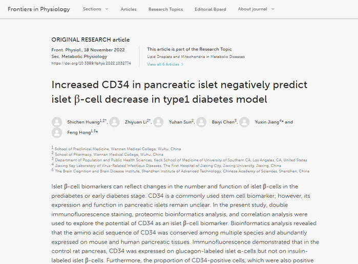 2020级药学专业本科生黄世辰、李志远等以共同第一作者身份,指导教师洪丰博士和姜玉新博士为共同通讯作者在JCR Q1区著名期刊Frontiers in physiology(IF=4.755)在线发表了题为“Increased CD34 in pancreatic islet negatively predict islet β-celldecrease in type1 diabetes model”的学术论文。该论文揭示了CD34分子在不同程度糖尿病大鼠模型胰岛结构中的变化关系及与胰岛内分泌细胞之间联系,并在此基础上进一步阐释了其作为糖尿病新型标志物的潜力和在糖尿病过程中可能发挥的作用,对糖尿病的早期诊断和发病机制的研究具有重要意义。(https://doi.org/10.3389/fphys.2022.1032774)。