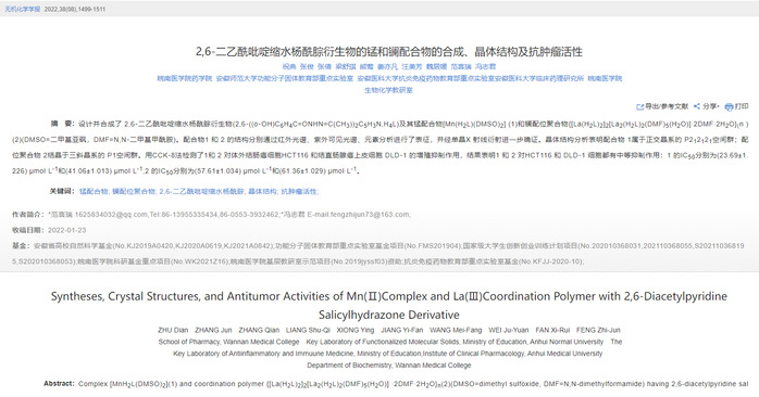 药学专业2018级本科生祝典、2019级本科生张俊等以共同第一作者身份,指导教师冯志君教授为论文通讯作者在SCI期刊《无机化学学报》在线发表了题为“2,6⁃二乙酰吡啶缩水杨酰腙衍生物的锰和镧配合物的合成、晶体结构及抗肿瘤活性”的学术论文。该论文设计并合成了2,6‐二乙酰吡啶缩水杨酰腙衍生物及其锰配合物和镧配位聚合物,两种金属配合物在体外对结肠癌细胞HCT116和结直肠腺癌上皮细胞DLD‐1具有很好增殖抑制作用,其为后续进一步开发靶向低毒、安全高效的新型无机药物的发展提供理论基础。(https://kns.cnki.net/kcms/detail/detail.aspx?dbcode=CJFD&dbname=CJFDLAST2022&filename=WJHX202208006&uniplatform=NZKPT&v=YjaKXXspPVoJXe8CWzYIfetWDUoF1KM-E0eN0KvA4tz8KUvtH1EZL201P8SU1zYp)
